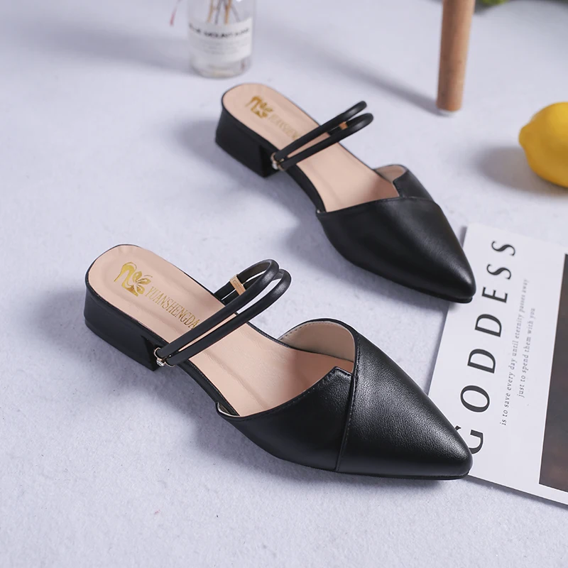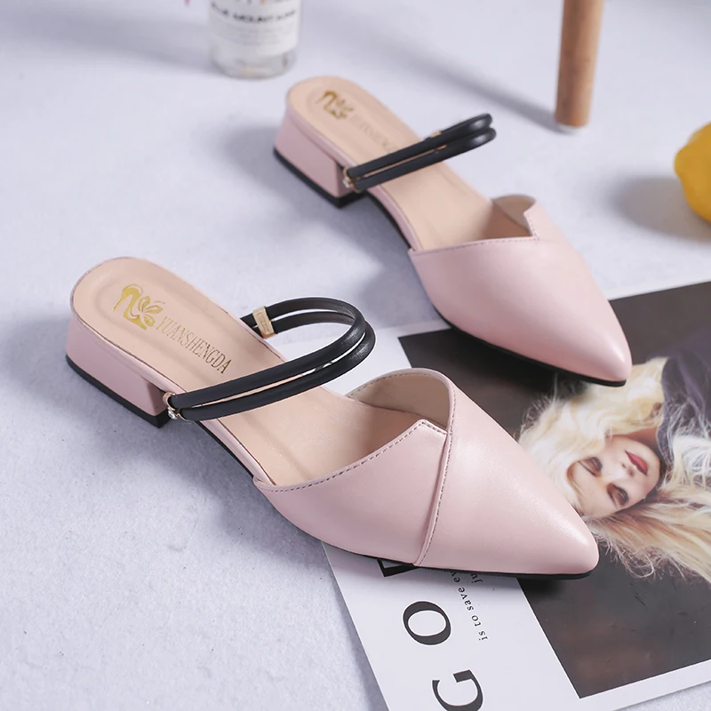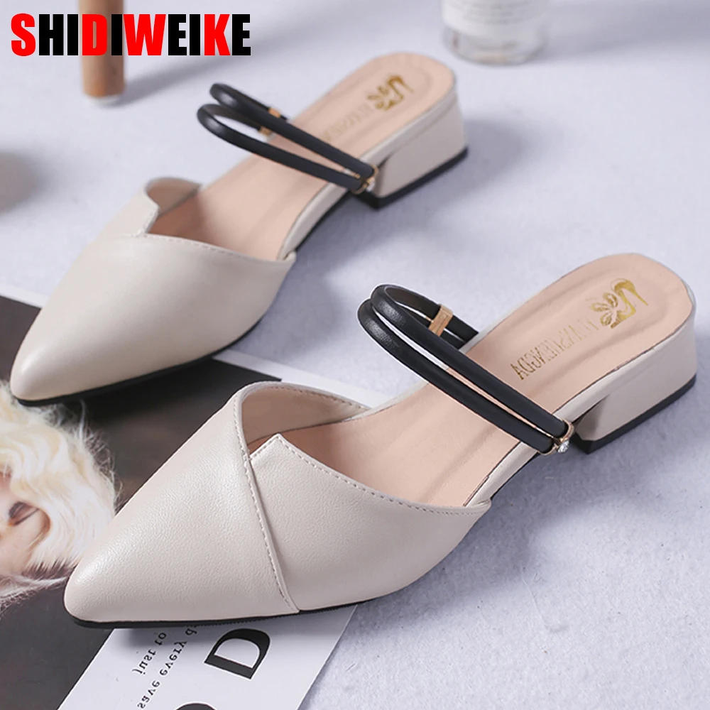 Special Offer Party Chic Vrouwen Muilezels Slipper Puntschoen Blok Riem Gesloten Ondiepe Hoge Hakken Schoenen Sandalen Zwart Beige Vierkante hak Pompen Discount 45% Today!