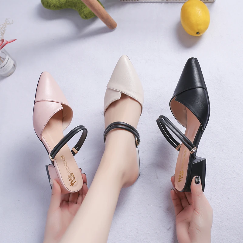 Product Name: Party Chic Vrouwen Muilezels Slipper Puntschoen Blok Riem Gesloten Ondiepe Hoge Hakken Schoenen Sandalen Zwart Beige Vierkante hak Pompen