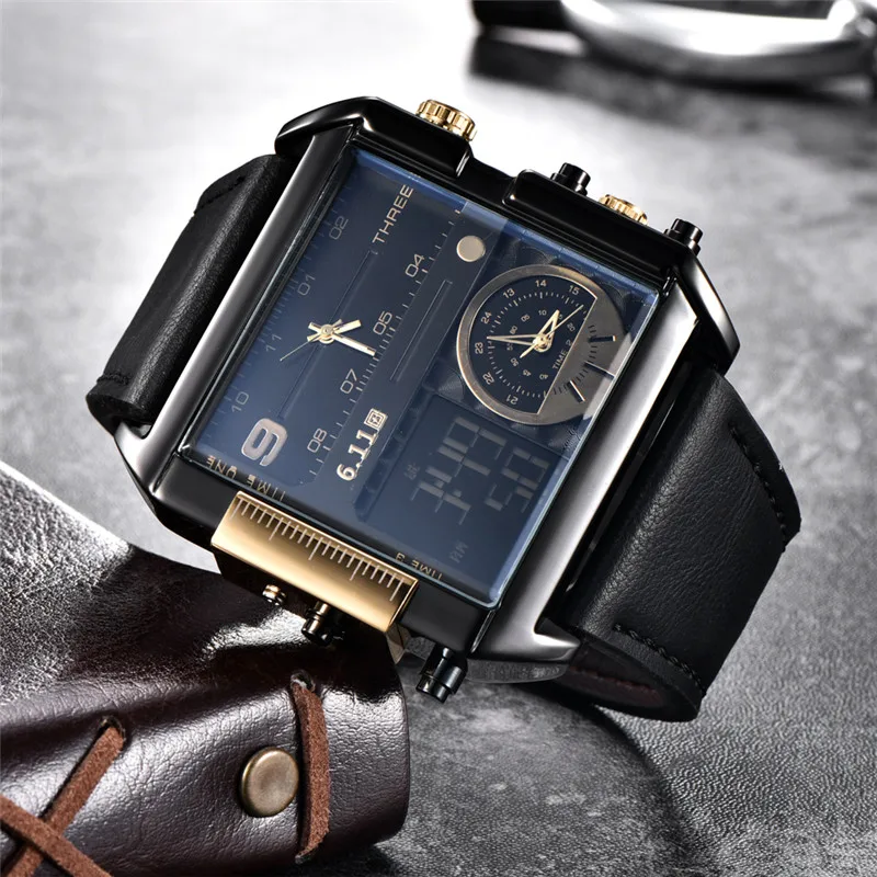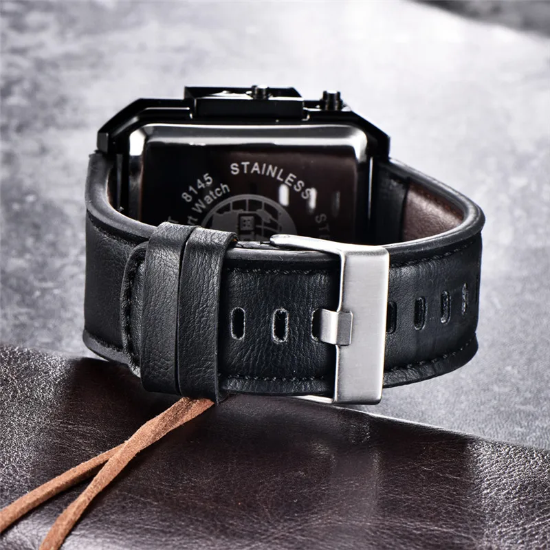 Product Name: Originele 6.11 Multiple Time Zone Quartz Horloges Vierkante Mannen Horloge Lederen LED Horloge Waterdicht Man Klok Relogio Masculino