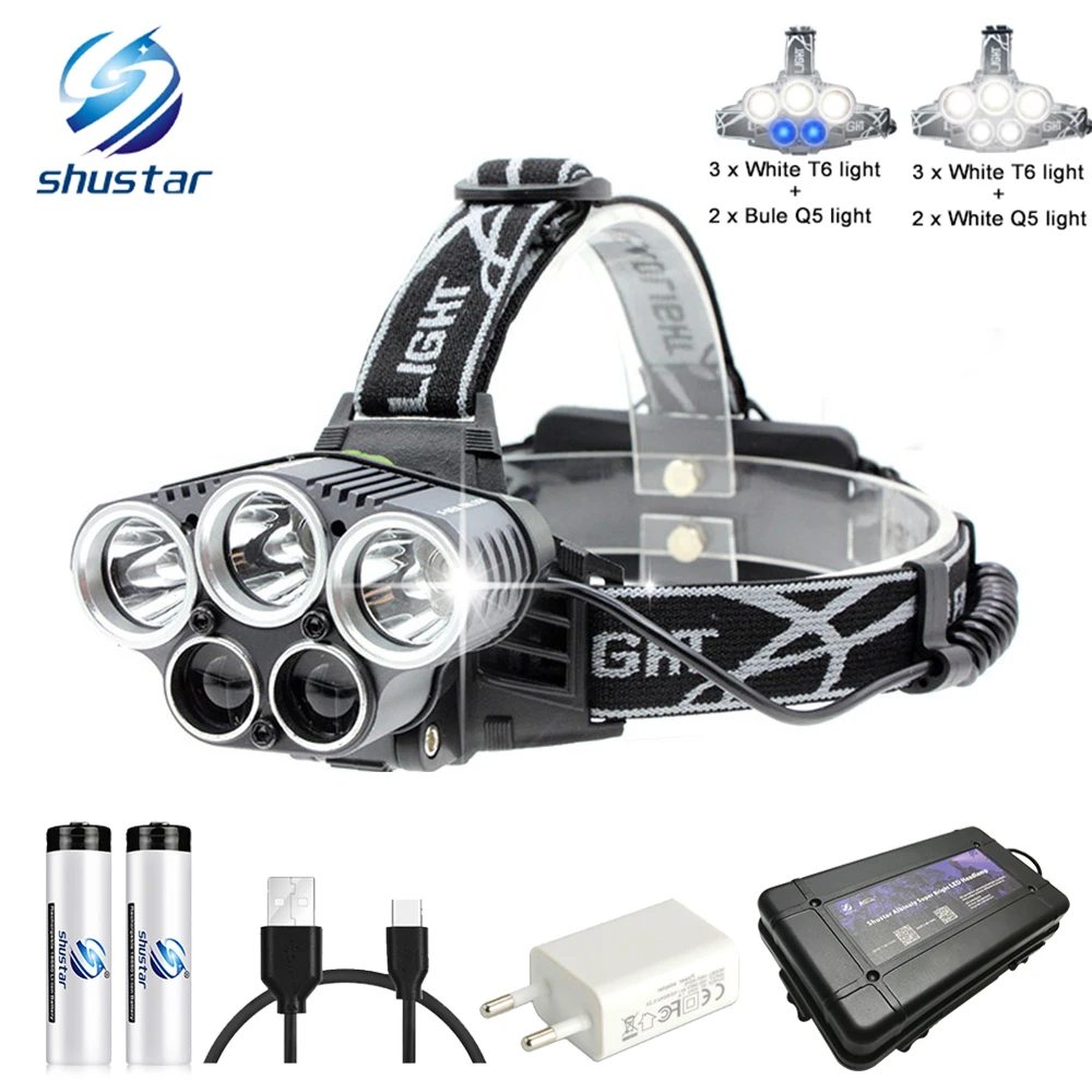 Product Name: USB oplaadbare LED Koplamp 5 wit licht of 3 wit + 2 bule licht waterdichte led koplamp vissen lamp gebruik 18650 batterij