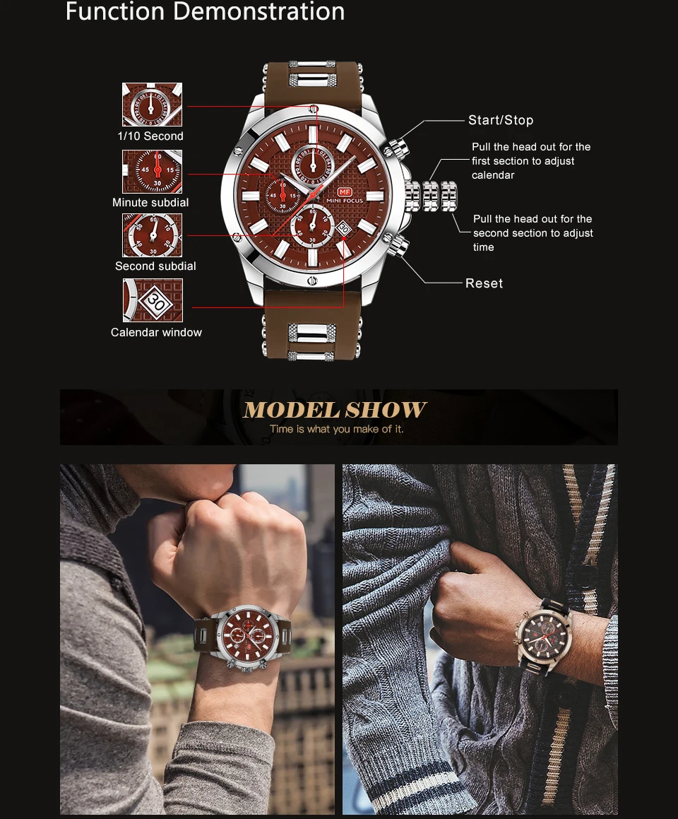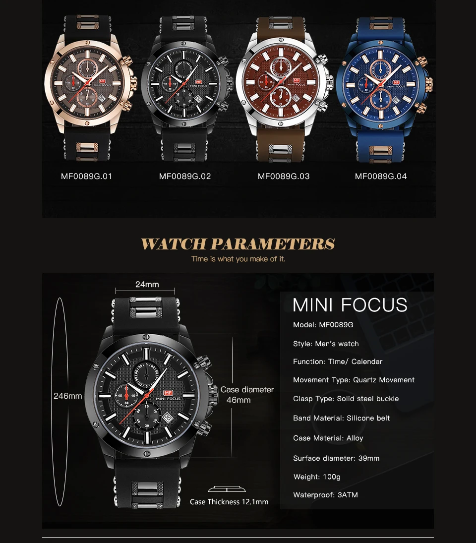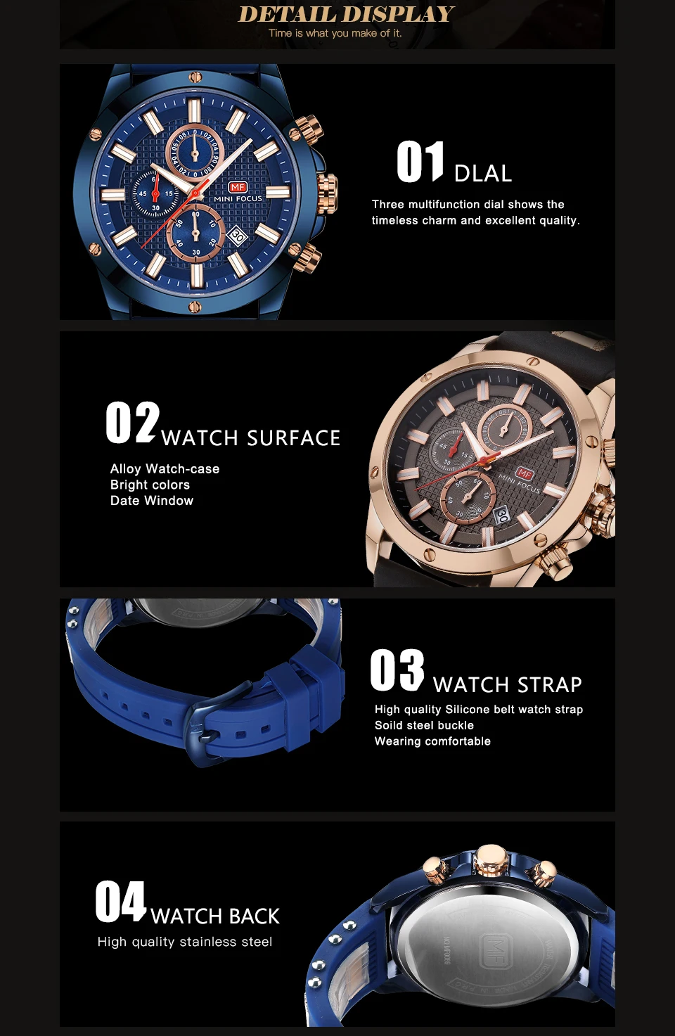 Product Name: MINIFOCUS Militaire Casual Horloge Mannen Quartz Klok Waterdichte Chic Chronograph Kalender Rubber Band Heren Horloges Topmerk Luxe