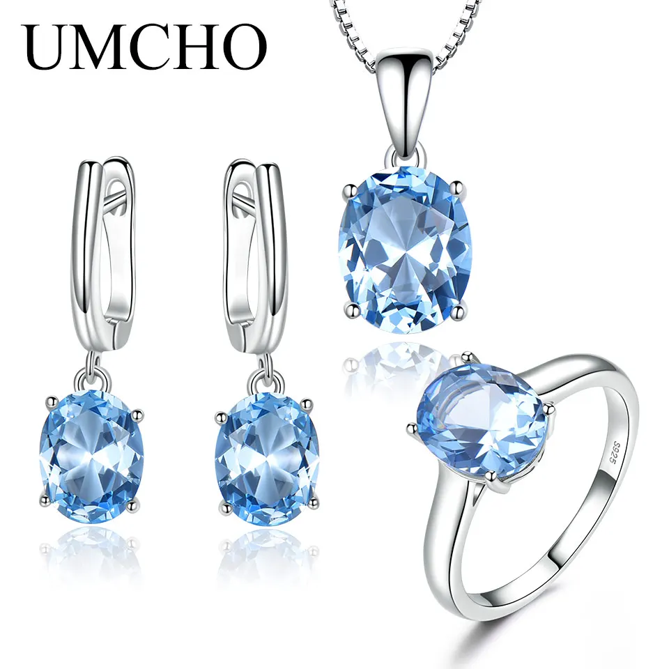 Special Offer UMCHO Sky Blue Topaz Gemstone Bruiloft Sieraden Sets voor Vrouwen 925 Sterling Zilveren Verlovingsringen Ketting Hanger Clip Oorbellen Discount 48% Today!