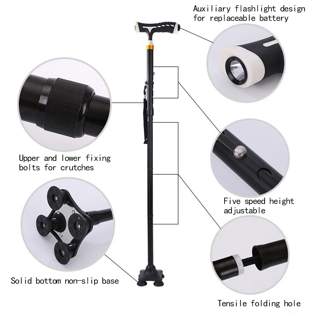 Product Name: LED Licht Opvouwbare Wandelstok Trekking T handvat Inklapbare Telescopische Wandelen Cane Viervoetige Met Lamp antislip Veilig stok