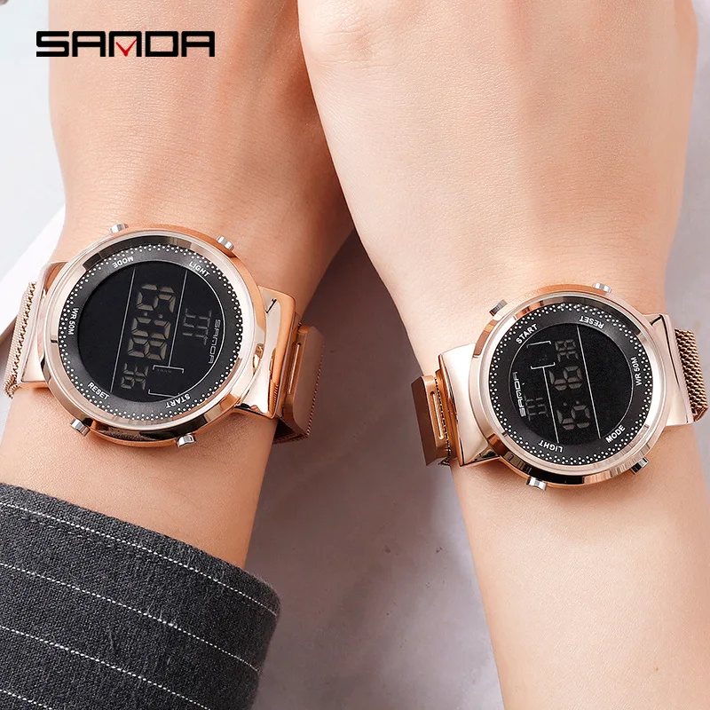 Product Name: Mode Rose Goud Vrouwen Mannen Magnetische Digitale Horloges Luxe Rvs LED Elektronische Horloges Waterdicht Sport Klok