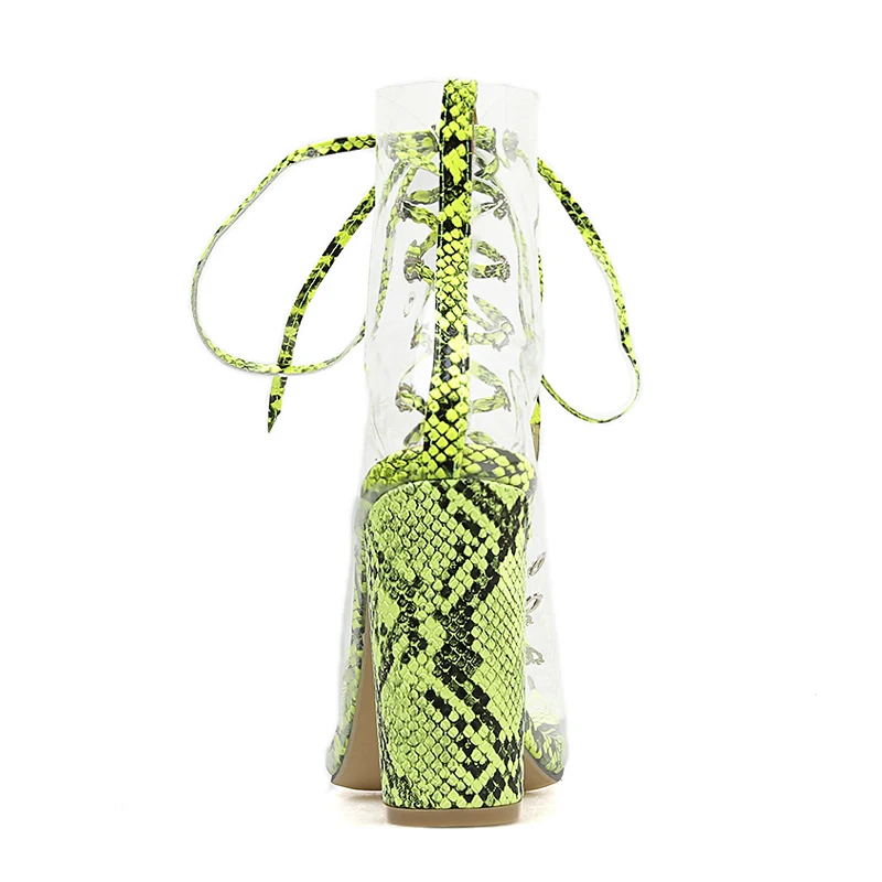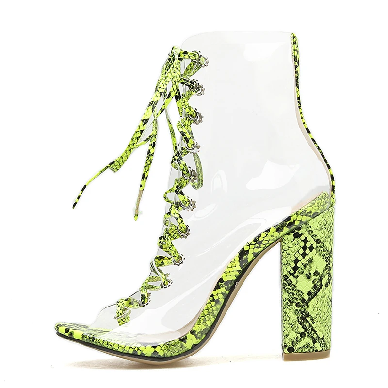 Product Name: Clear PVC Vrouwen Pompen Sandalen Chunky Hakken Lace Up Pompen Mujer Dames Snkake Print Zomer Laarzen Party Vrouwen Pompen Groen zapatos