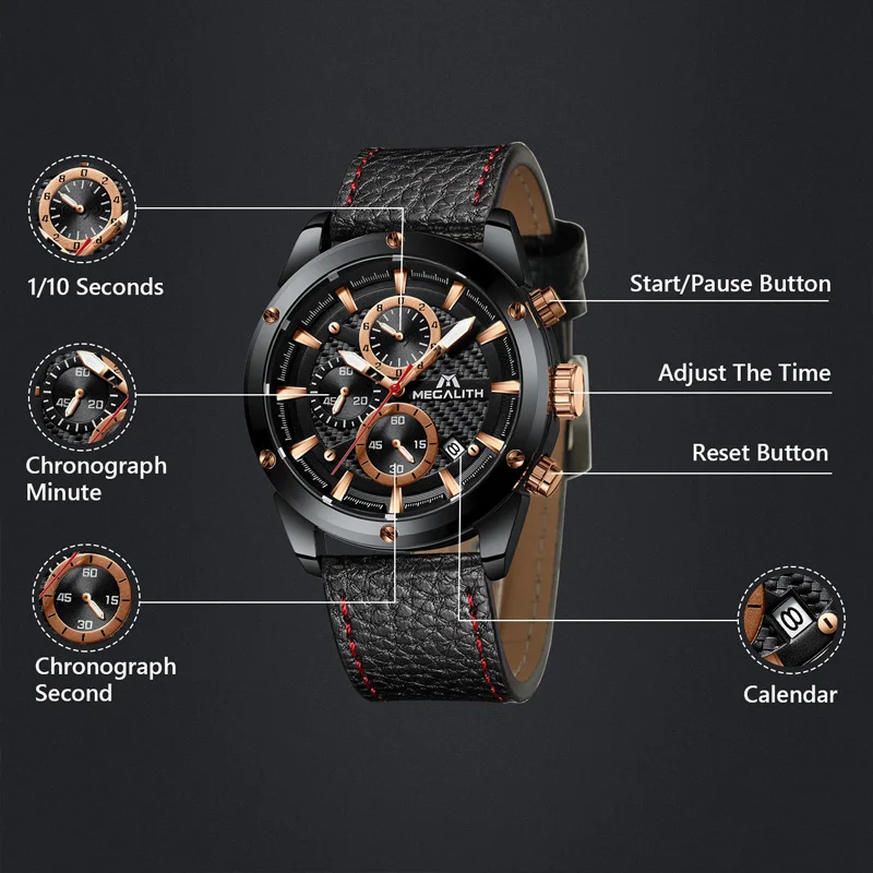 Product Name: MEGALITH Mode Militaire Horloge Sport Mannen Horloges Waterdicht Chronograaf Klok Mannen Lederen Band Quartz Horloges Mannelijke 8004